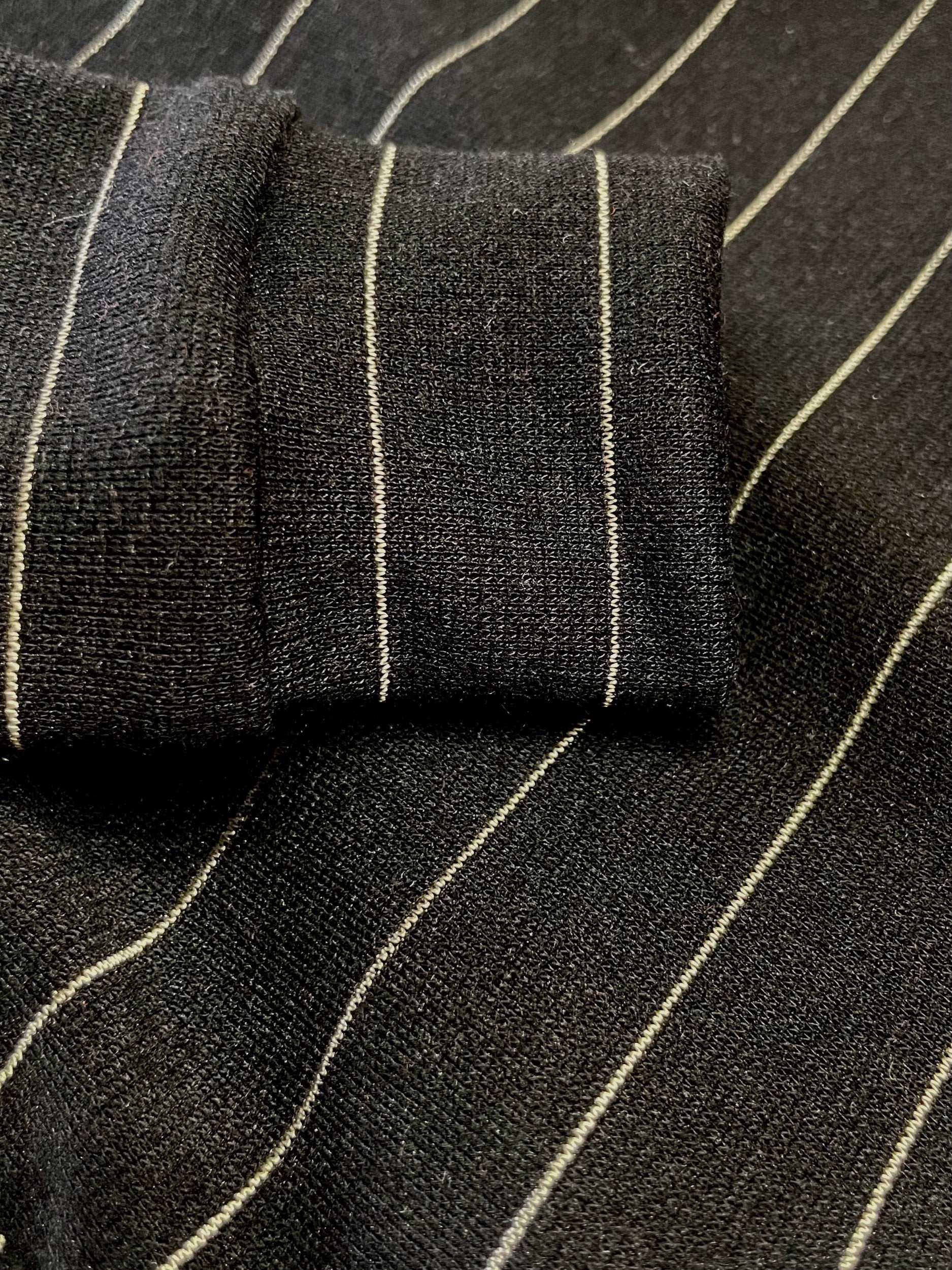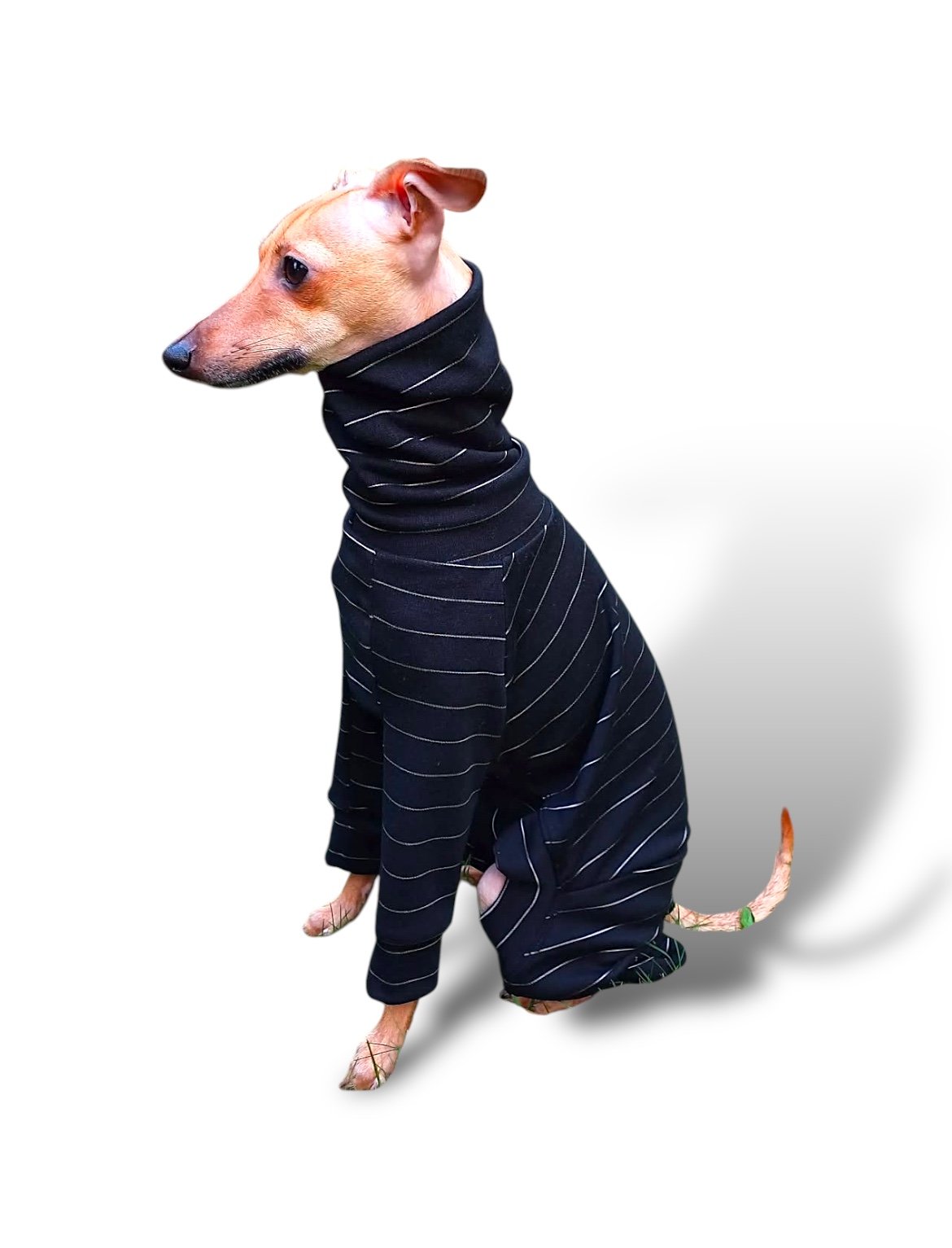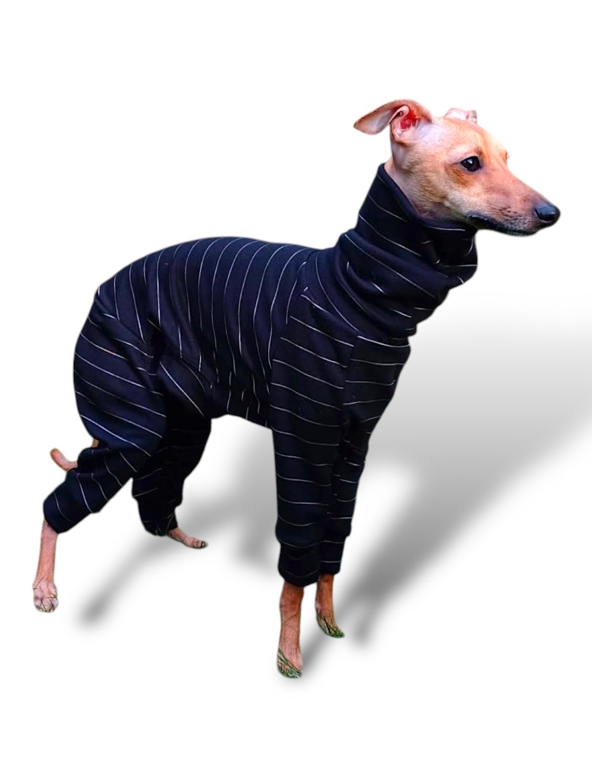 Black jersey featuring subtle silver pinstripes in a four legged suit.