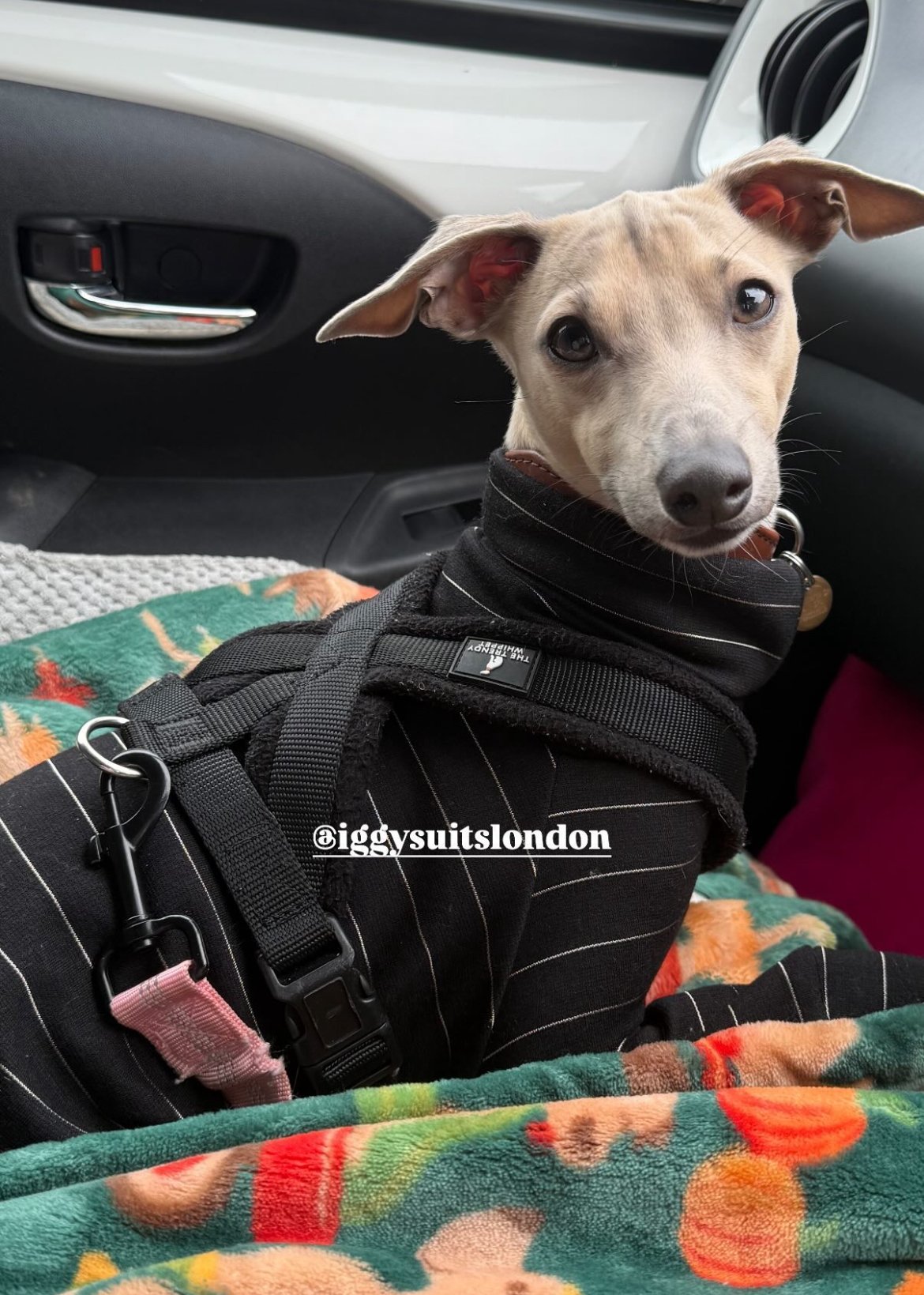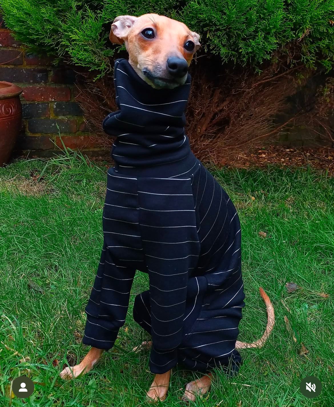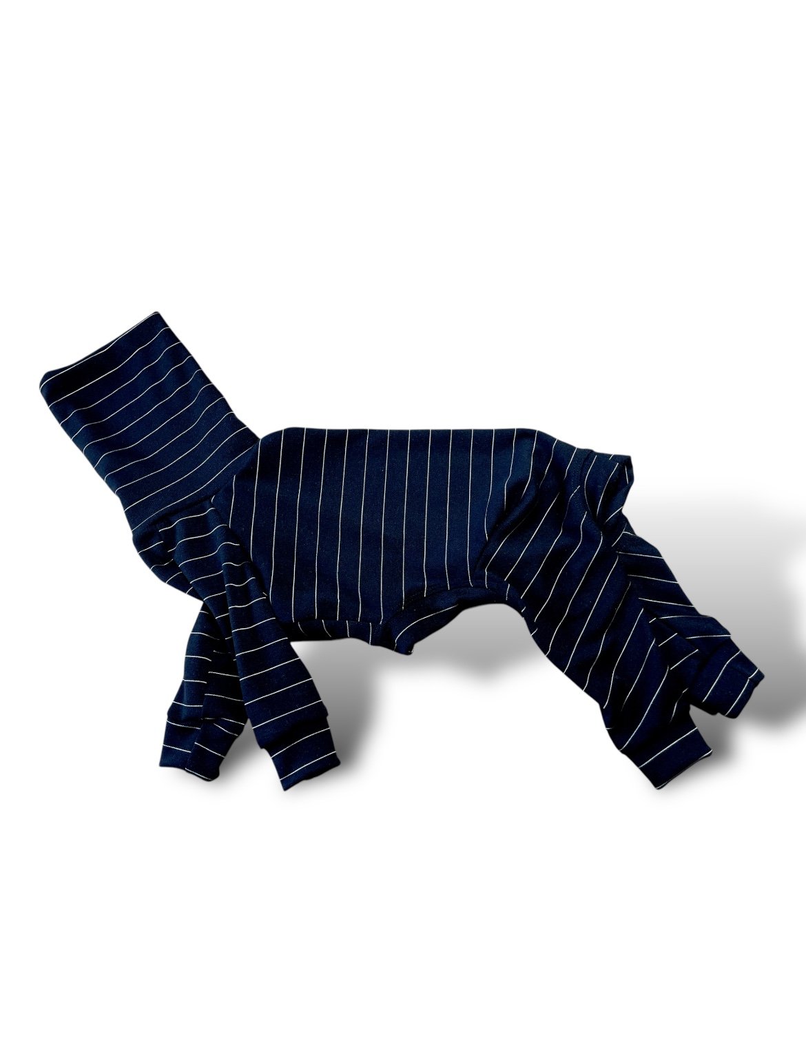 Black jersey featuring subtle silver pinstripes in a four legged suit.