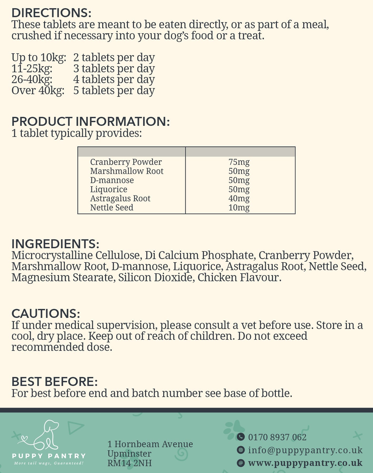 Ingredients: Microcrystalline Cellulose, Di Calcium Phosphate, Cranberry Powder, Marshmallow Root, D-mannose, Liquorice, Astragalus Root, Nettle Seed, Magnesium Stearate, Silicon Dioxide, Chicken Flavour.