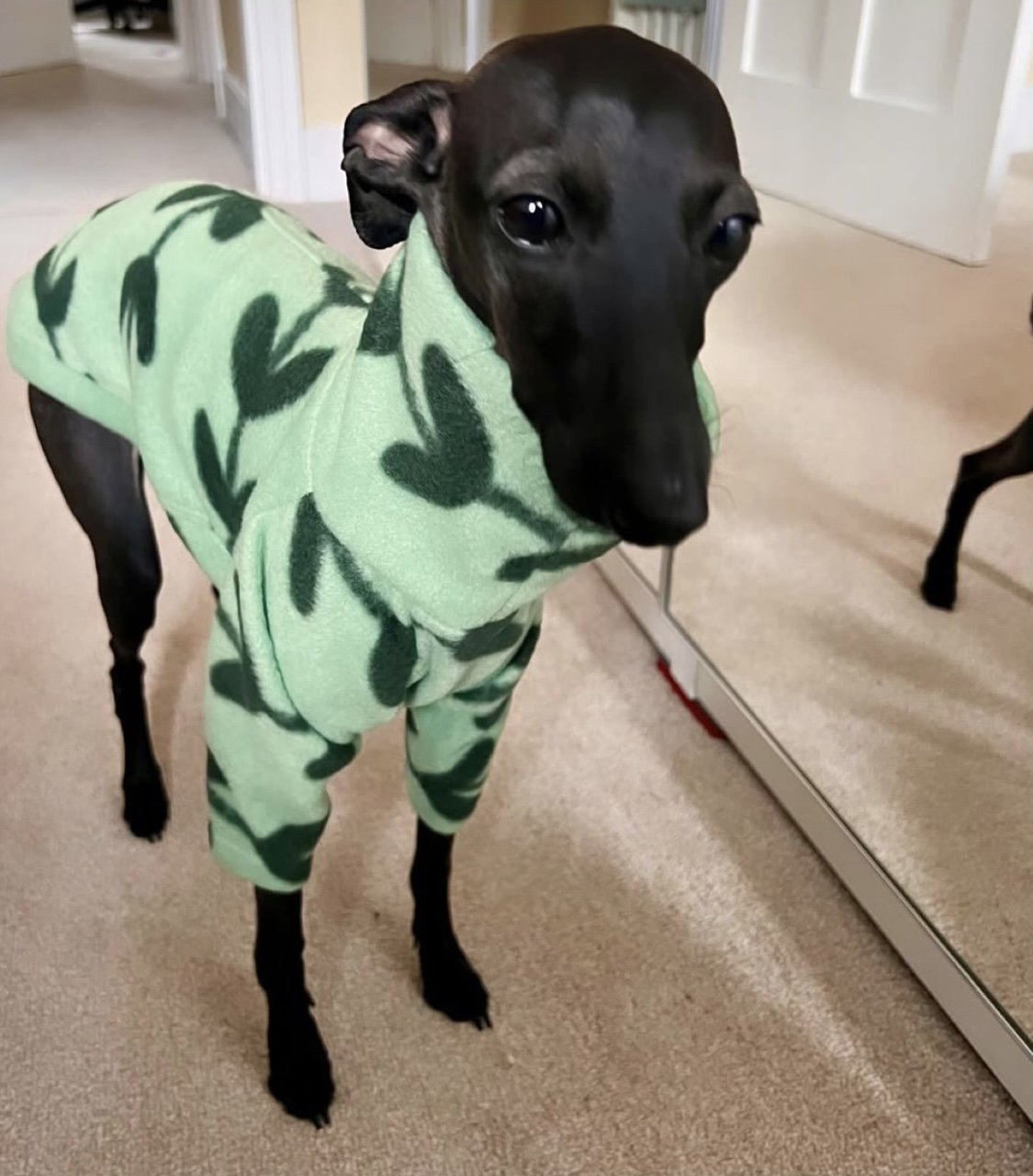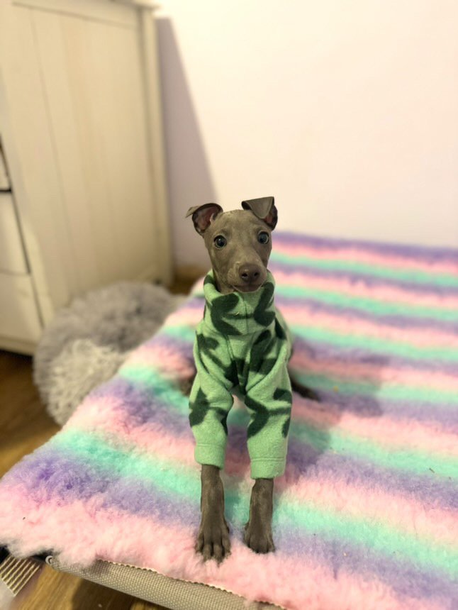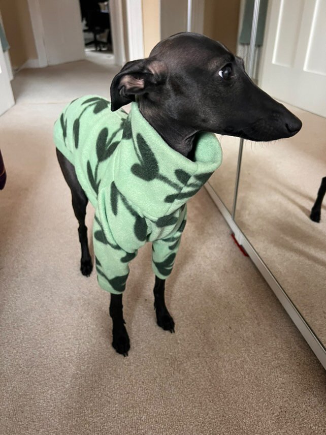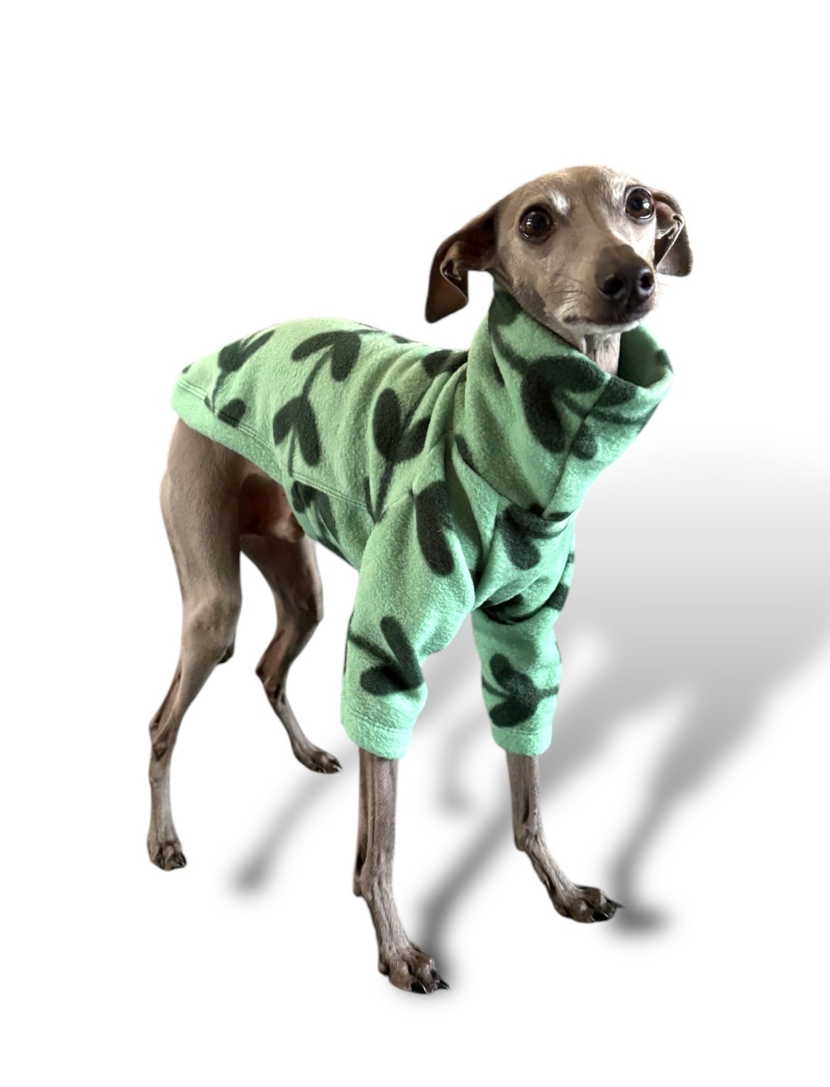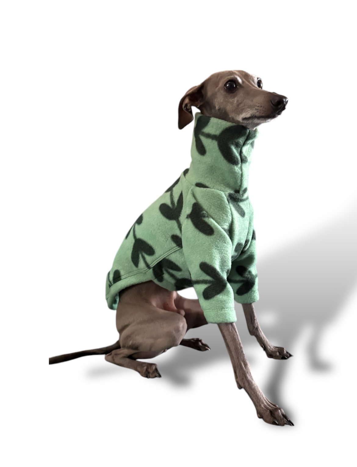 Our IggySuitsLondon green vines fleece jumper with 2 legs.
