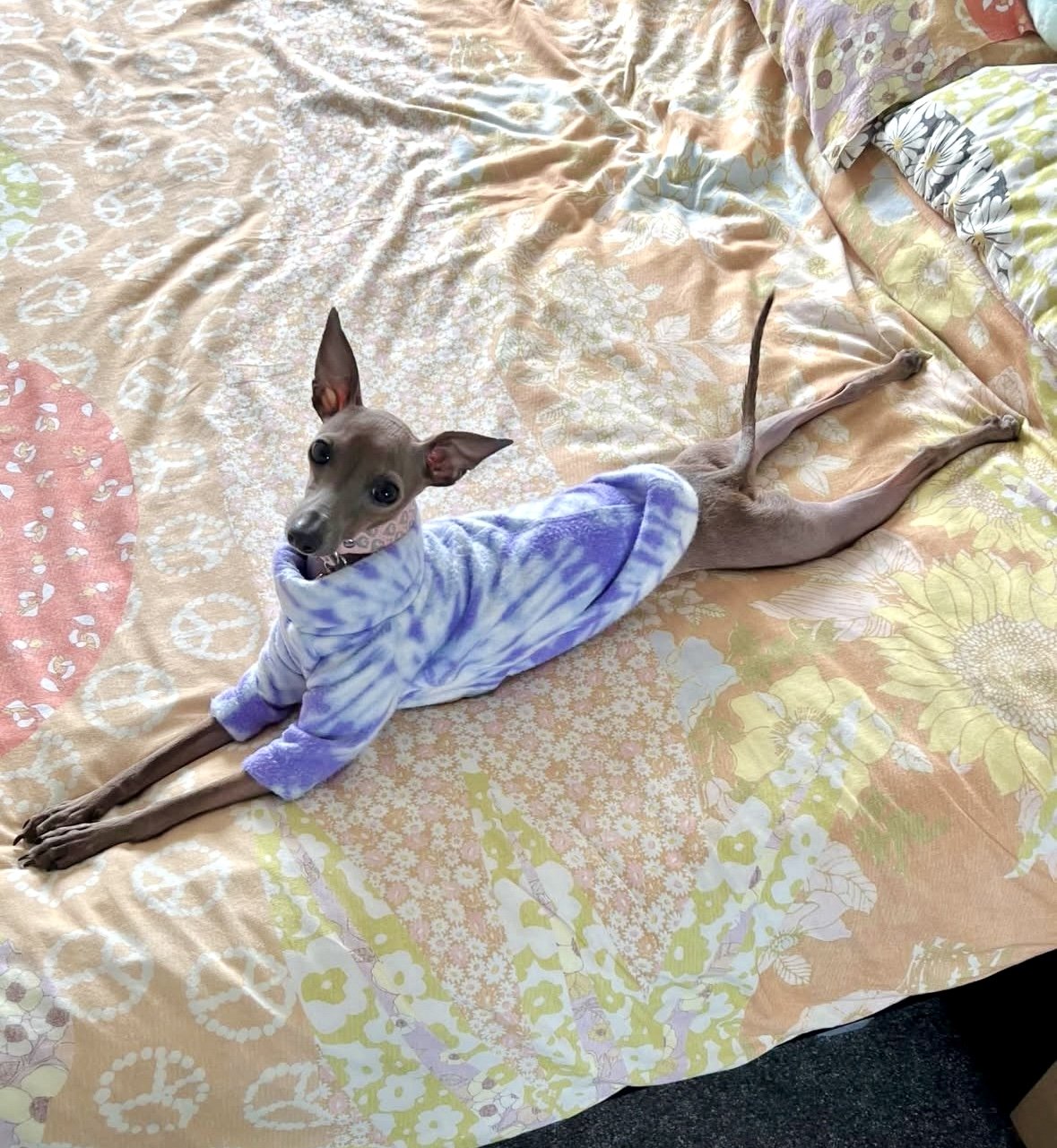 Our IggySuitsLondon purple tie dye fleece jumper with 2 legs.