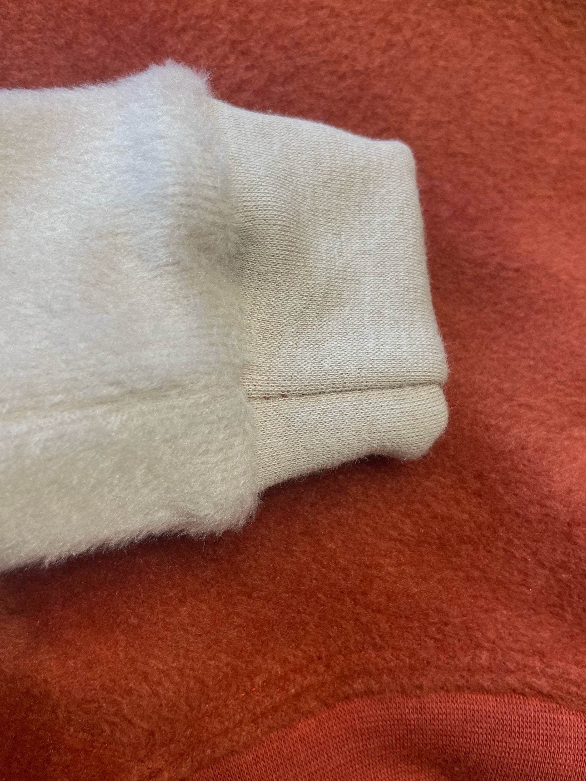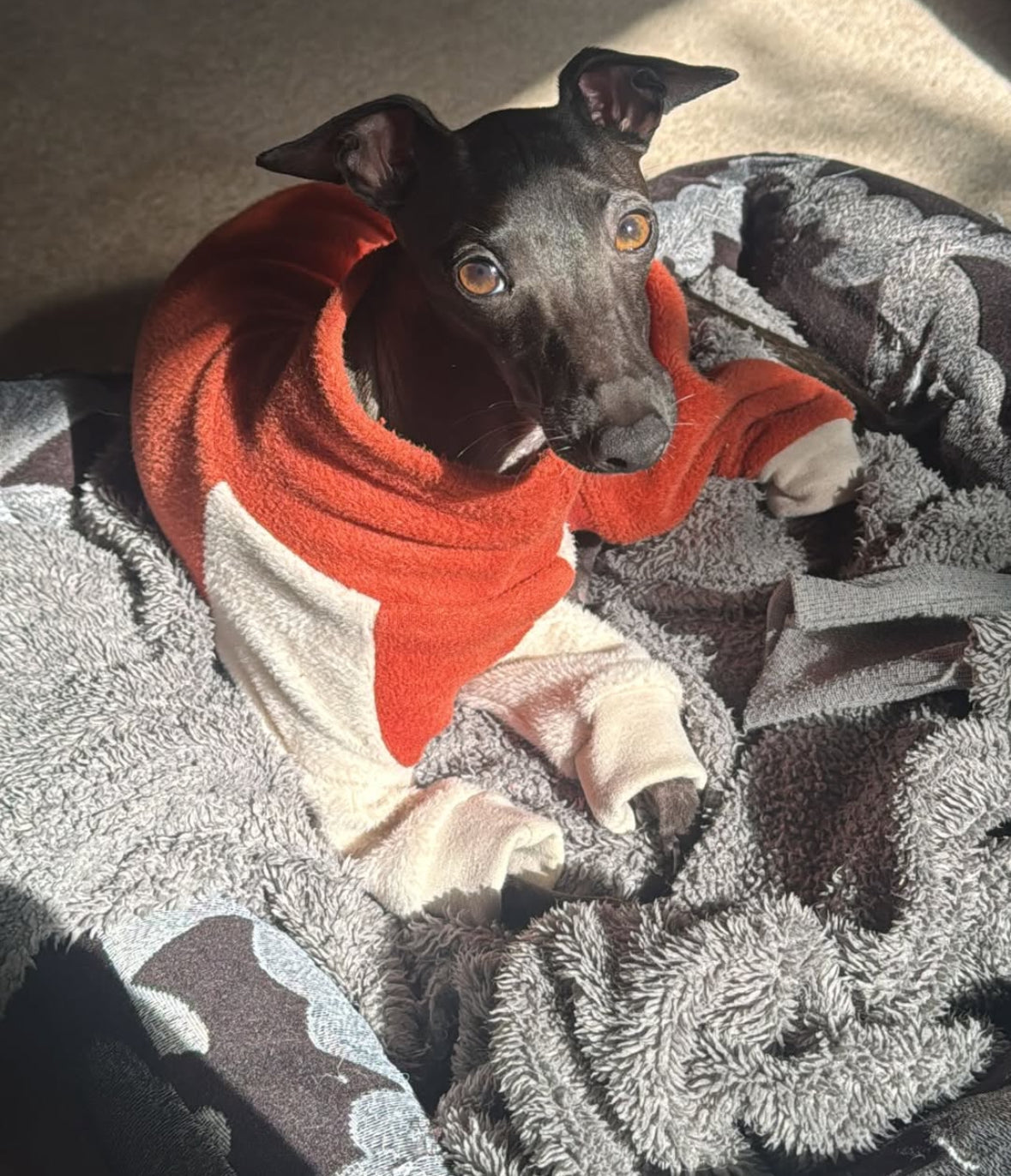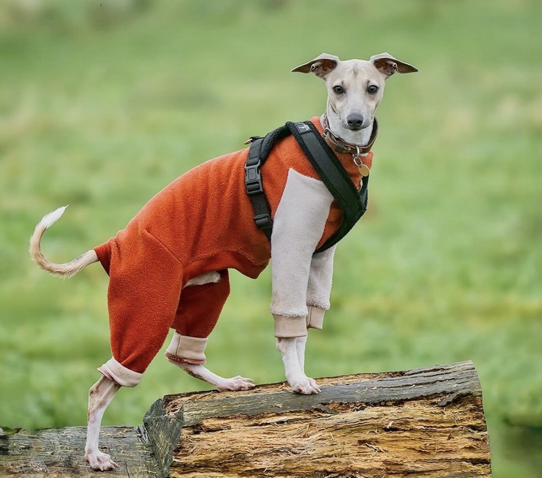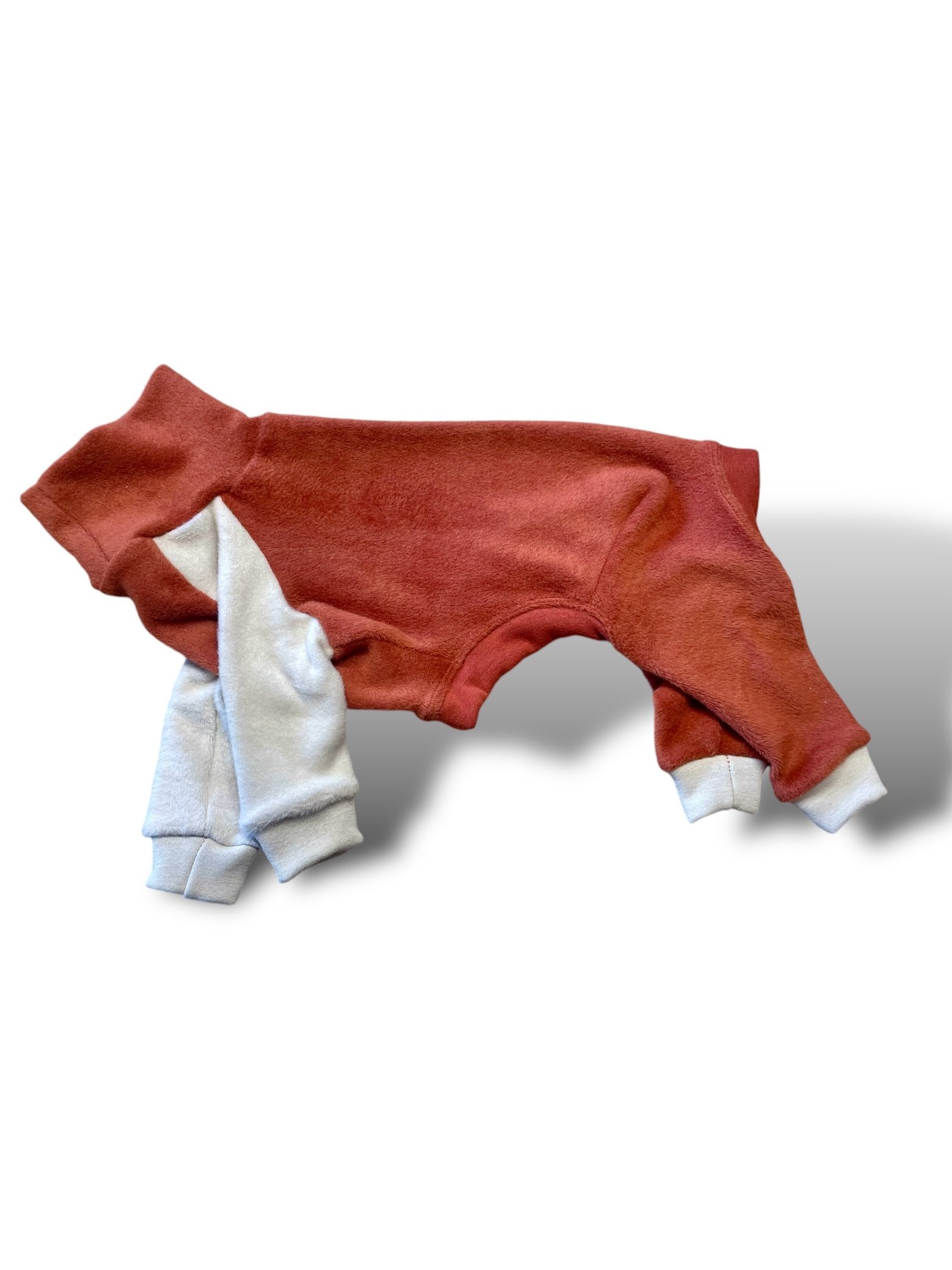 Our IggySuitsLondon fleece lined sweatshirt suit in rust with stone accents with 4 legs.