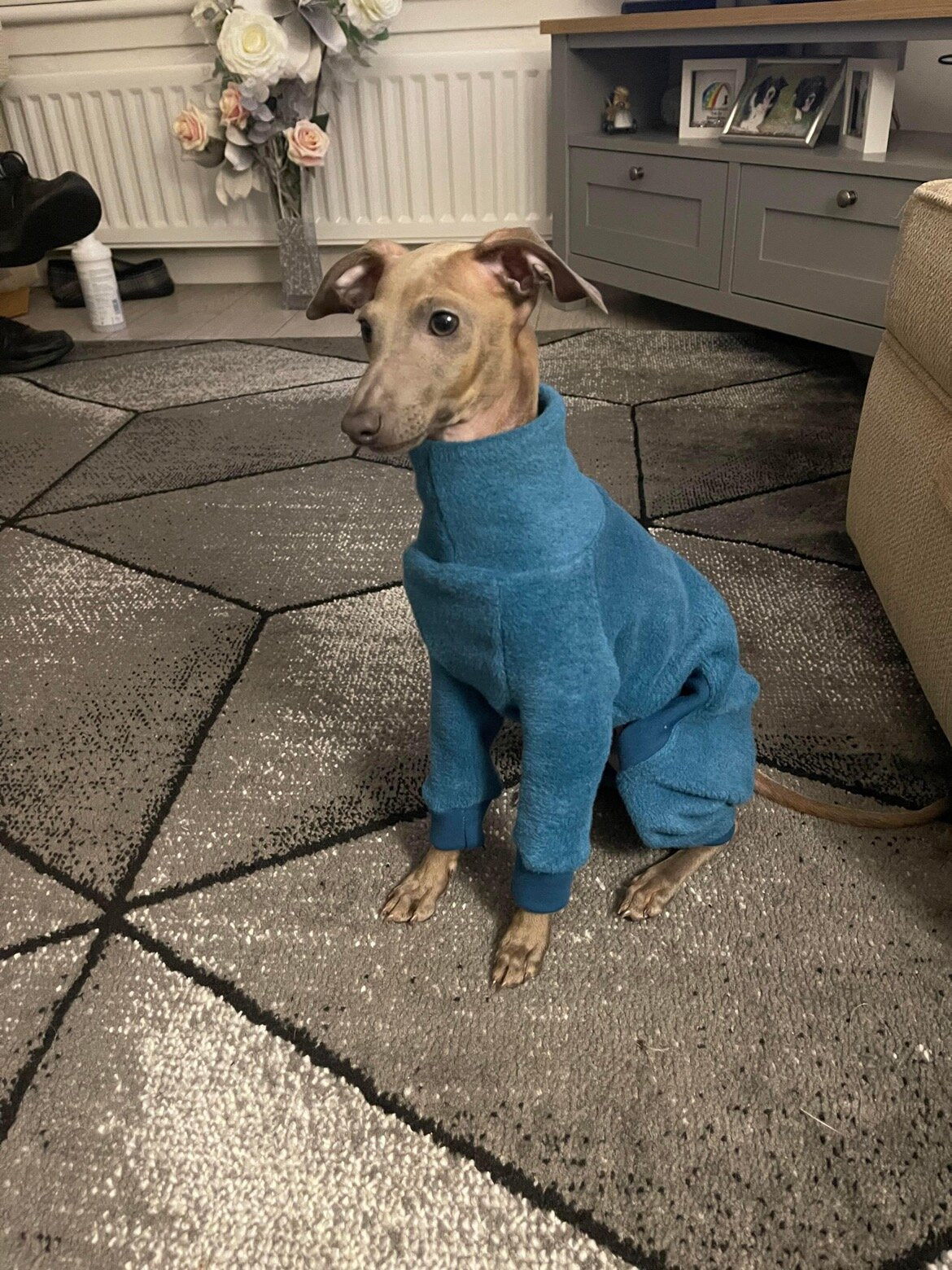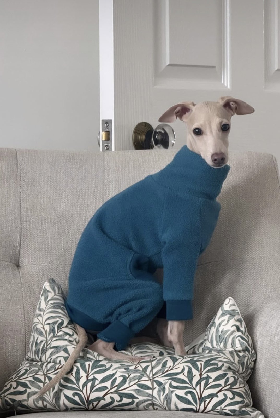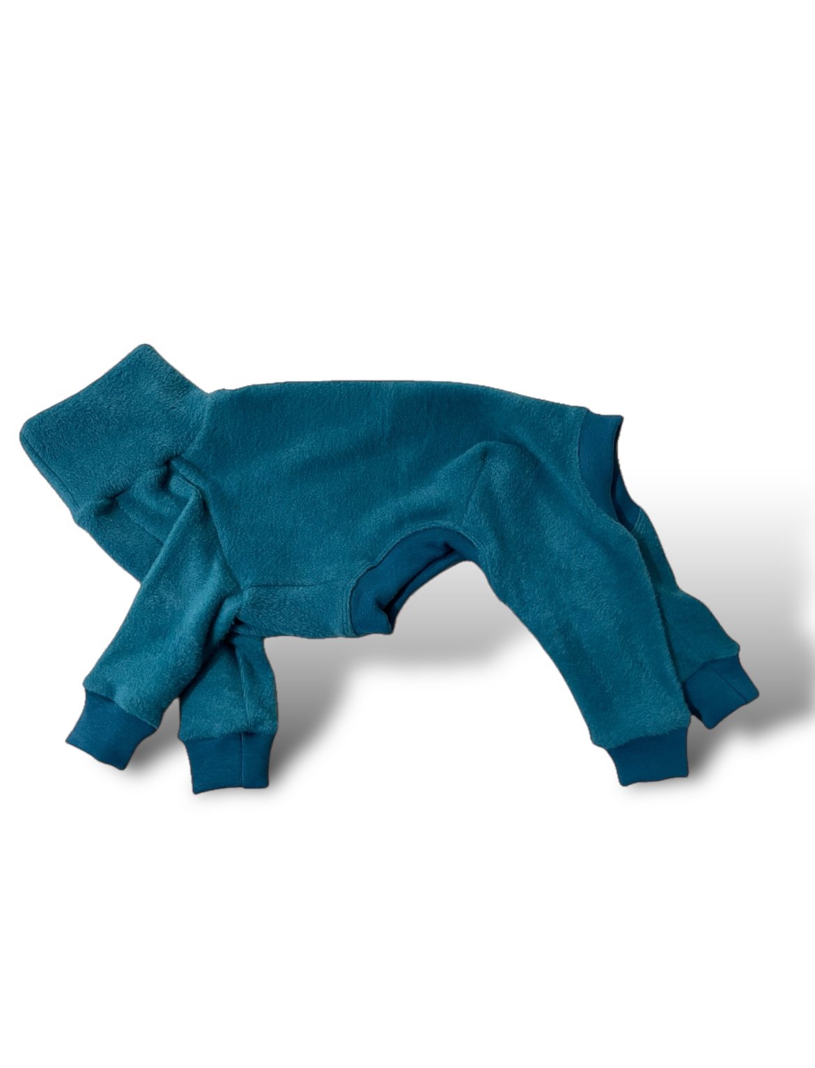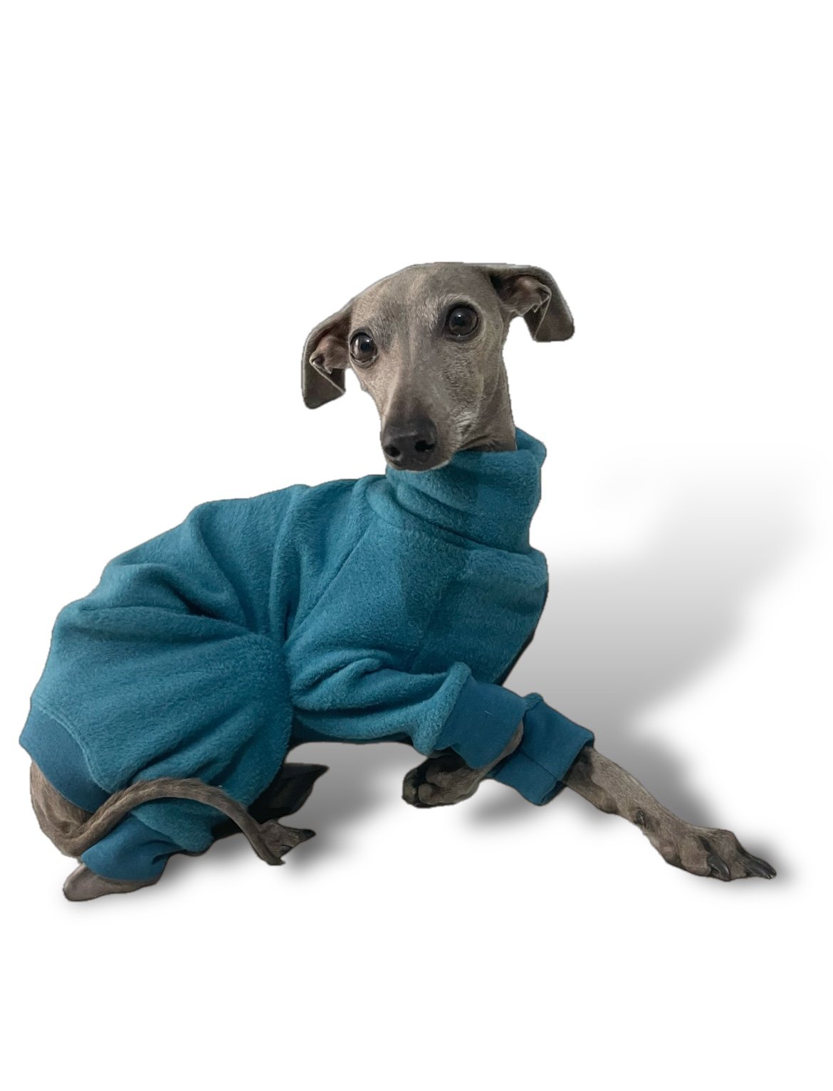 Made from soft and stretchy teal sweatshirt material on the inner which is lined with soft furry fleece on the outer (otherwise known as alpine fleece). A thick, warm and cosy addition to your hounds wardrobe this winter.