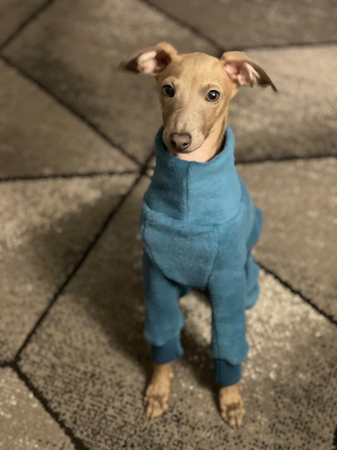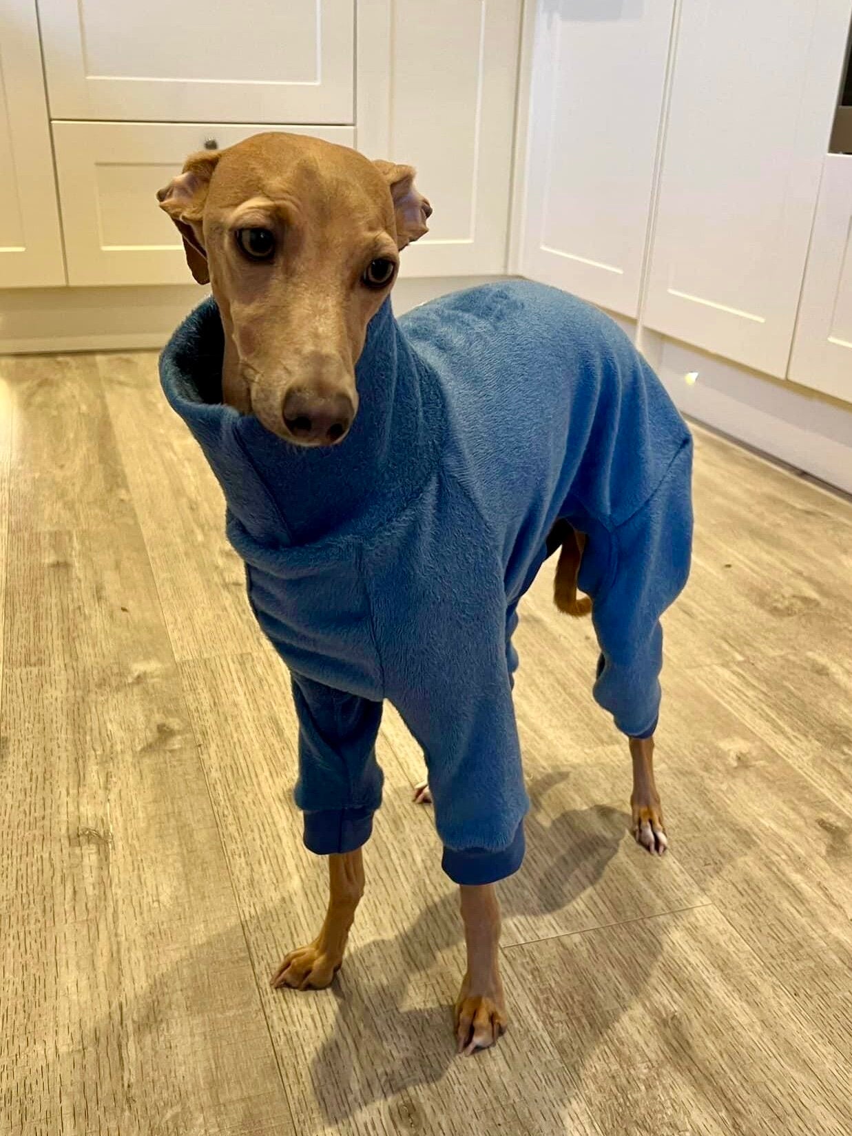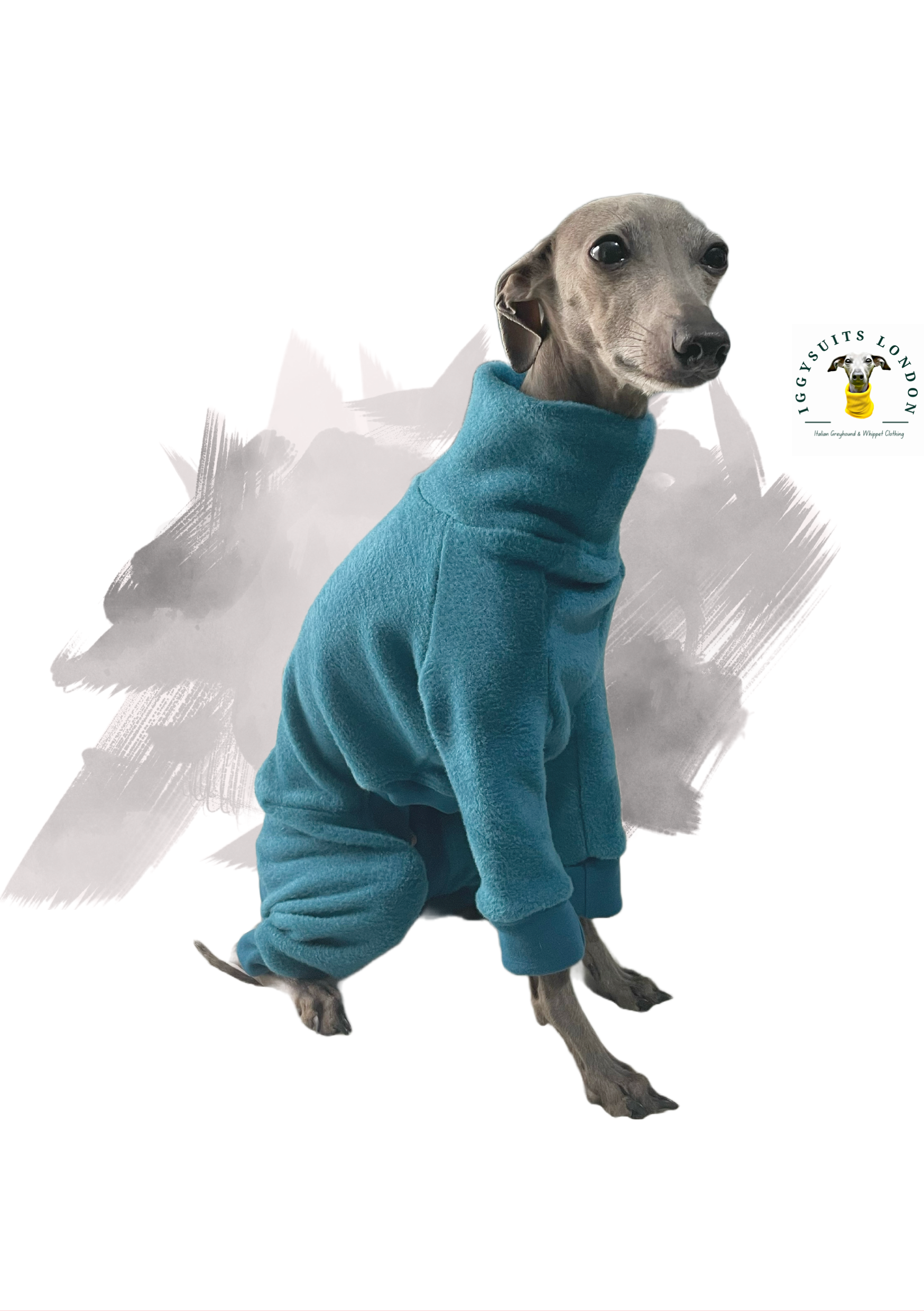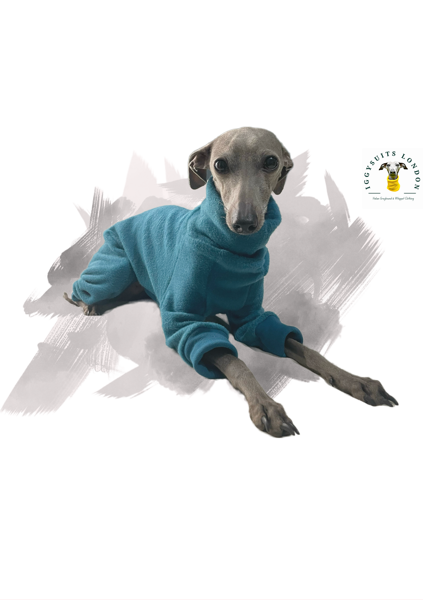 Made from soft and stretchy teal sweatshirt material on the inner which is lined with soft furry fleece on the outer (otherwise known as alpine fleece). A thick, warm and cosy addition to your hounds wardrobe this winter.