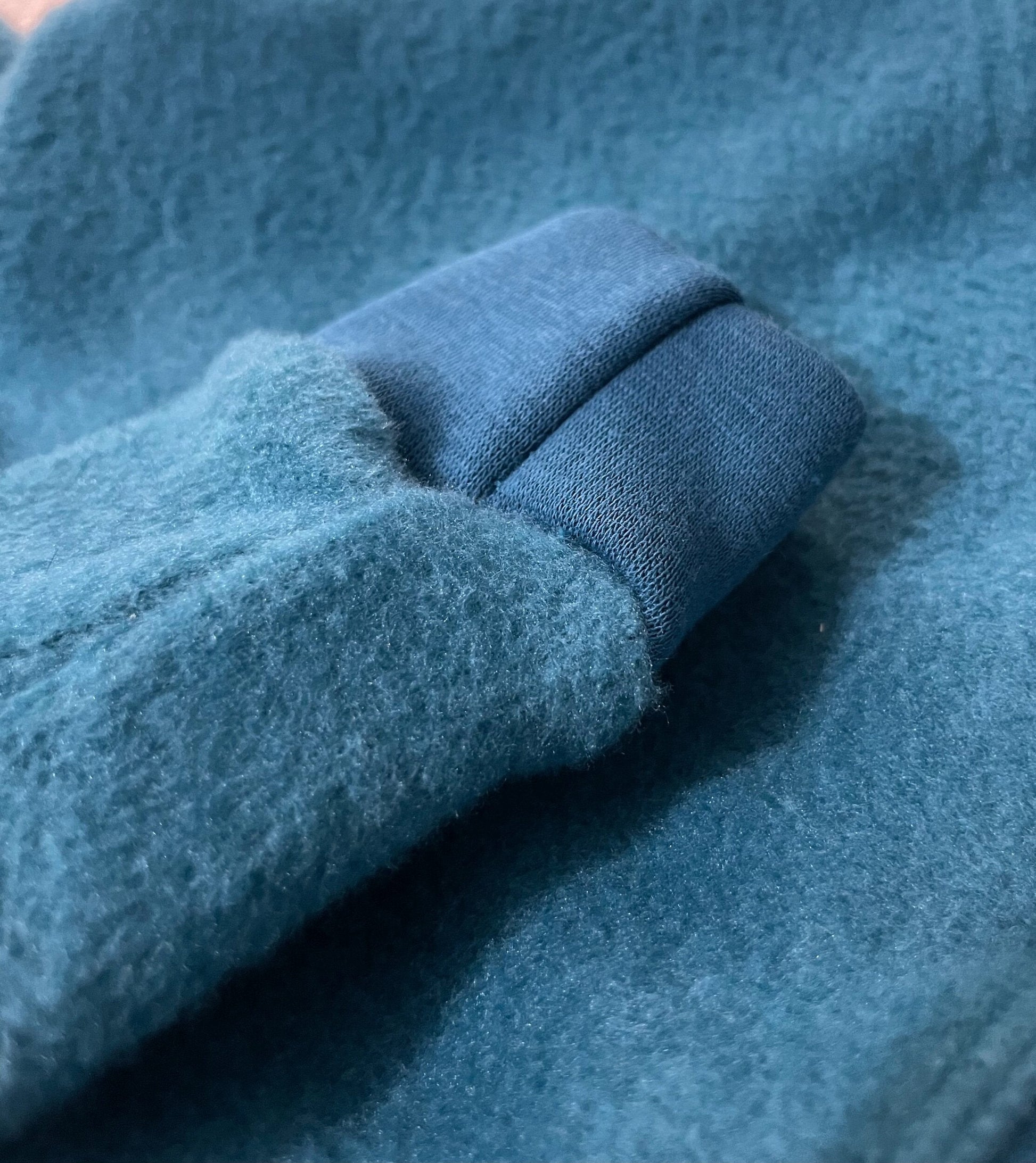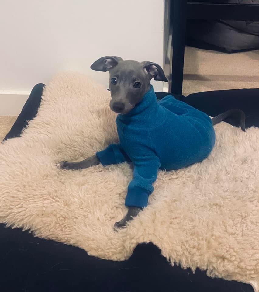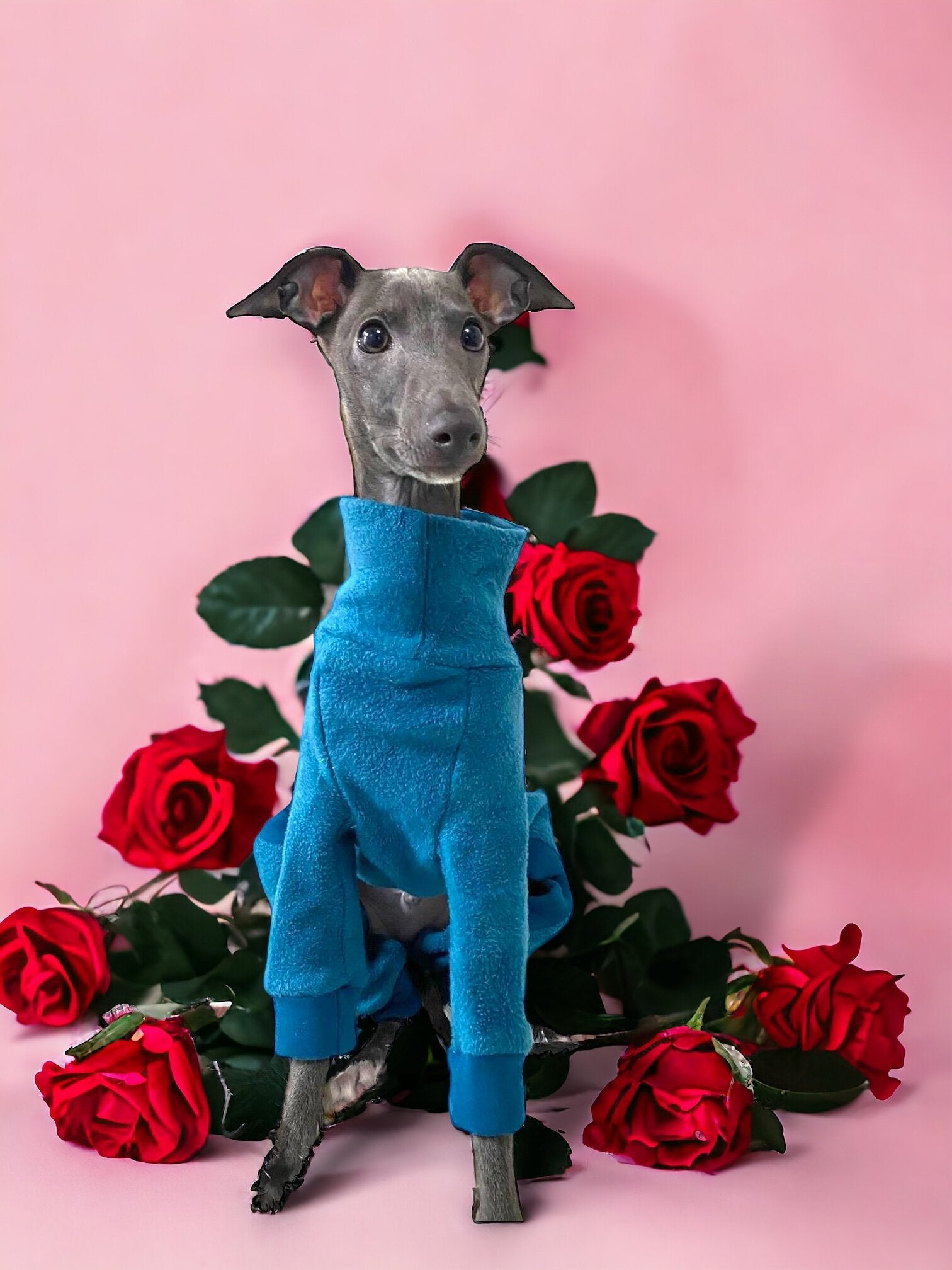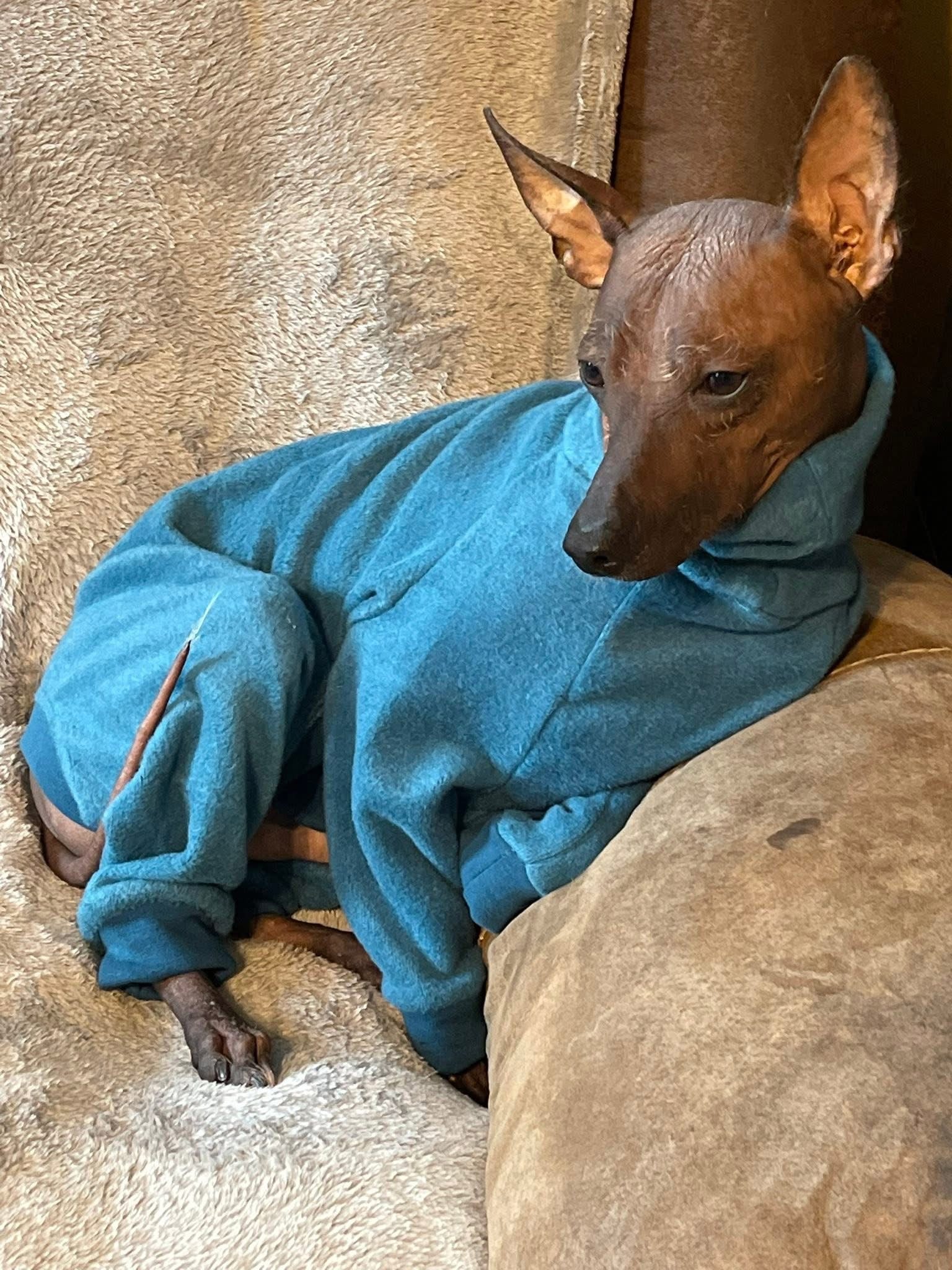 Made from soft and stretchy teal sweatshirt material on the inner which is lined with soft furry fleece on the outer (otherwise known as alpine fleece). A thick, warm and cosy addition to your hounds wardrobe this winter.