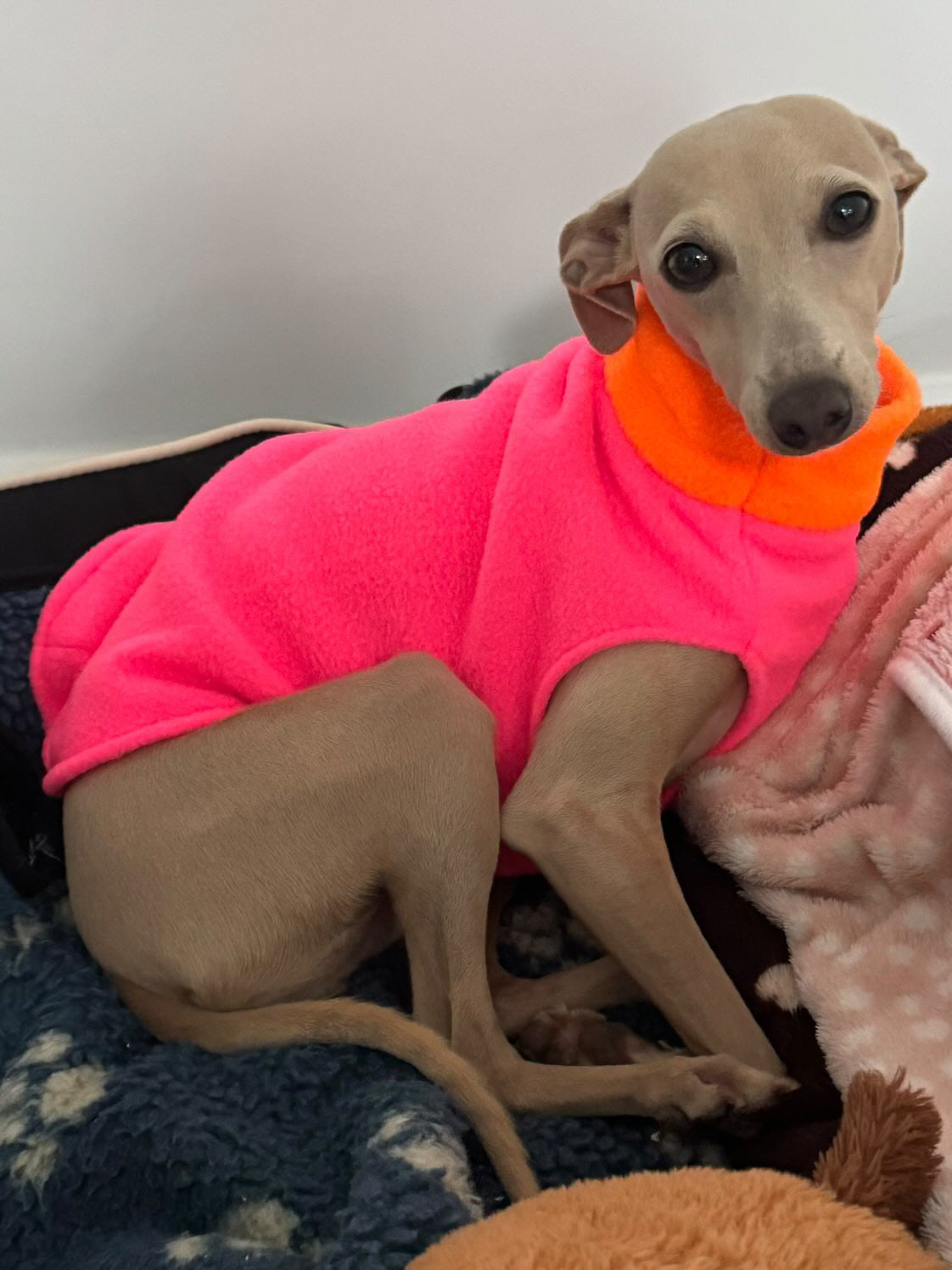 Sleeveless polar fleece vest in our tiniest size perfect for Italian Greyhound puppies from 6 weeks old. Perfect if you want to be prepared for your new arrival.