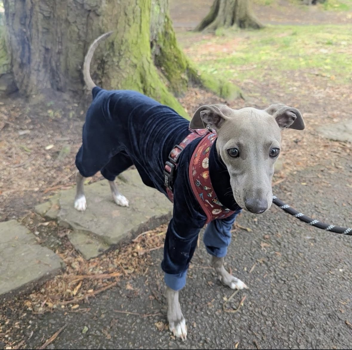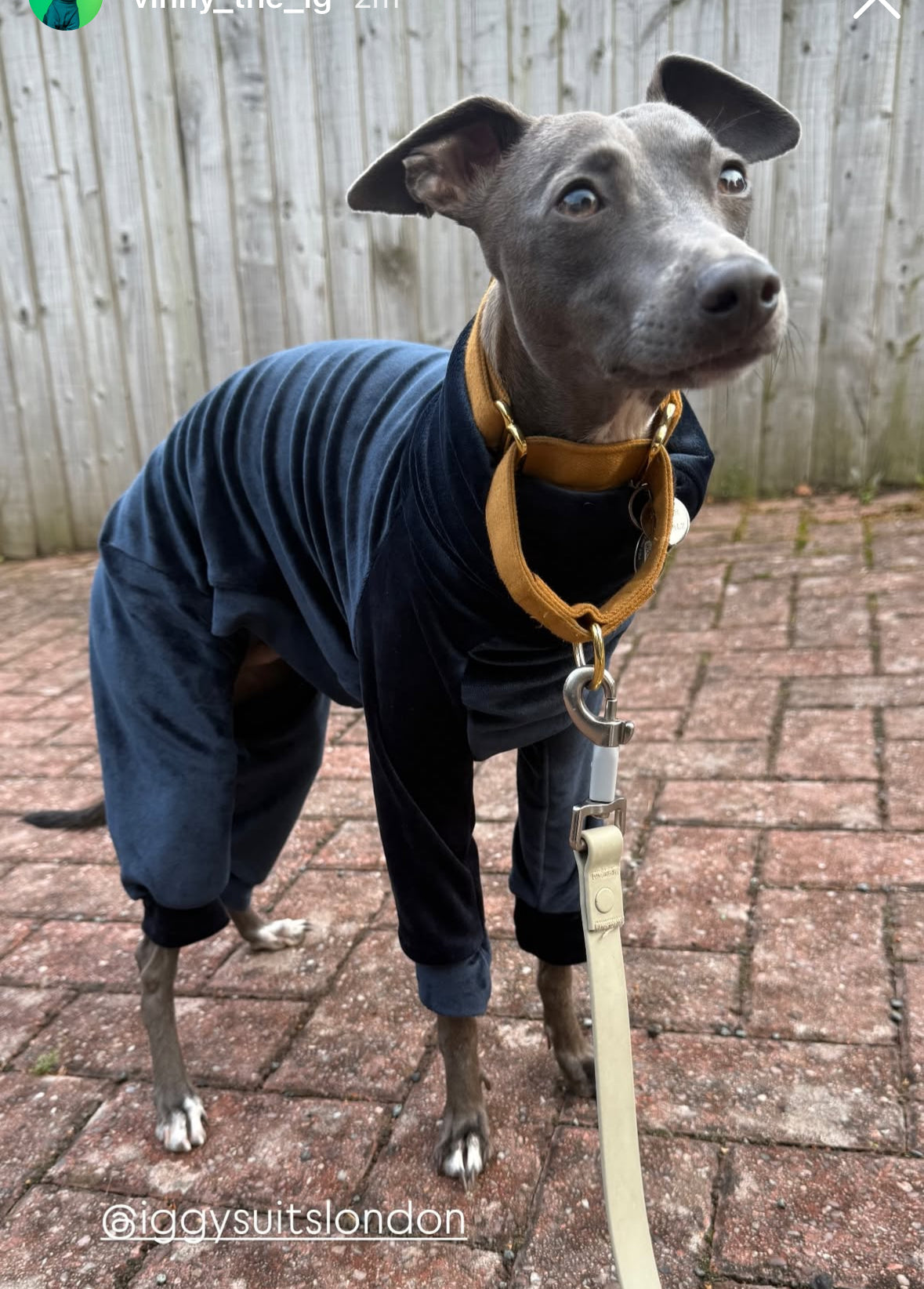 Made from the most wonderfully soft minky velour stretch jersey. The photos don't do it justice how soft this material is whilst maintaining maximum stretch and breathability. Please note that the shade of navy blue is darker than the photos on the dog show.